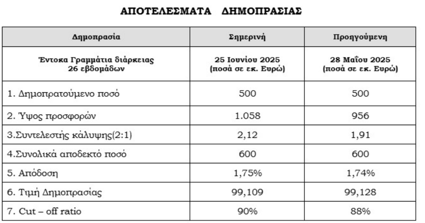 Έγιναν δεκτές προσφορές μέχρι του ύψους του δημοπρατηθέντος ποσού, καθώς και μη ανταγωνιστικές προσφορές ύψους 100 εκατομμυρίων Ευρώ. Δε θα γίνουν αποδεκτές συμπληρωματικές μη ανταγωνιστικές προσφορές την Πέμπτη 26 Ιουνίου 2025. Σημειώνεται ότι κατά τις δημοπρασίες δεν καταβάλλεται προμήθεια.
