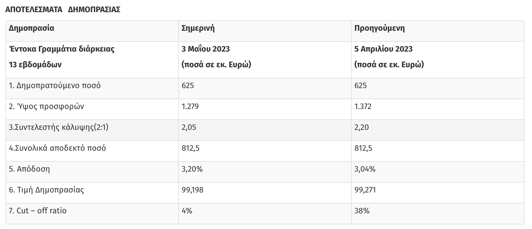 Η δημοπρασία πραγματοποιήθηκε μέσω των Βασικών Διαπραγματευτών Αγοράς (Primary Dealers), και η ημερομηνία διακανονισμού είναι η Παρασκευή 5 Μαΐου 2023.