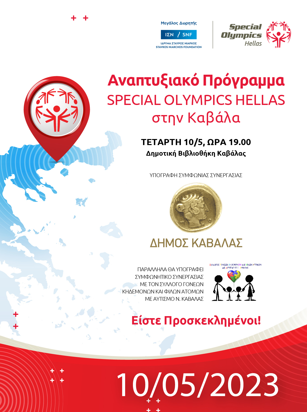 Το Τοπικό Πρόγραμμα Special Olympics Καβάλας θα εγκαινιαστεί με την υπογραφή Συμφωνίας Συνεργασίας μεταξύ του Προέδρου των Special Olympics Hellas, Πρέσβυ ε.τ. κ. Διονύσιου Κοδέλλα, και του Δημάρχου Καβάλας κου Θεόδωρου Μουριάδη, την Τετάρτη 10/5, ΩΡΑ 19.00 στη Δημοτική Βιβλιοθήκη Καβάλας.