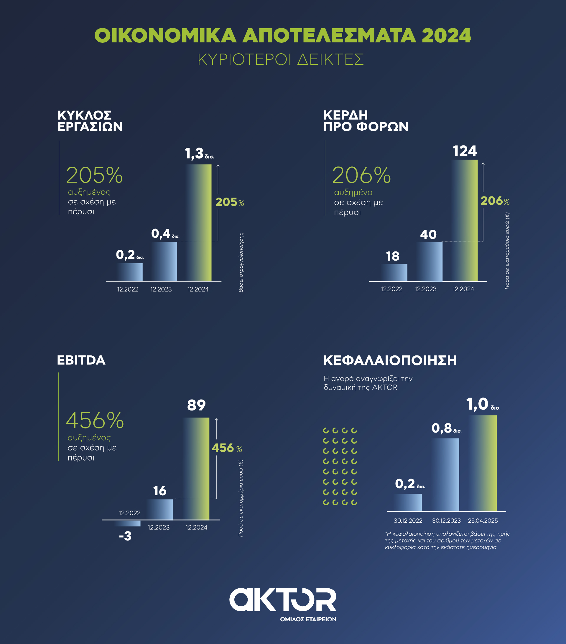 Πλήρη αναβάθμιση όλων των κρίσιμων οικονομικών μεγεθών πέτυχε το 2024 ο AKTOR Όμιλος Εταιρειών, σύμφωνα με τις ετήσιες οικονομικές καταστάσεις για το έτος 2024 που ανακοινώθηκαν σήμερα και σηματοδοτούν την αποφασιστική υλοποίηση της νέας επιχειρηματικής στρατηγικής του Ομίλου για κερδοφόρα έργα και διαφοροποίηση των πηγών εσόδων του, μέσα από ένα νέο μοντέλο λειτουργίας και μεγάλες επενδύσεις σε νέα πεδία.
