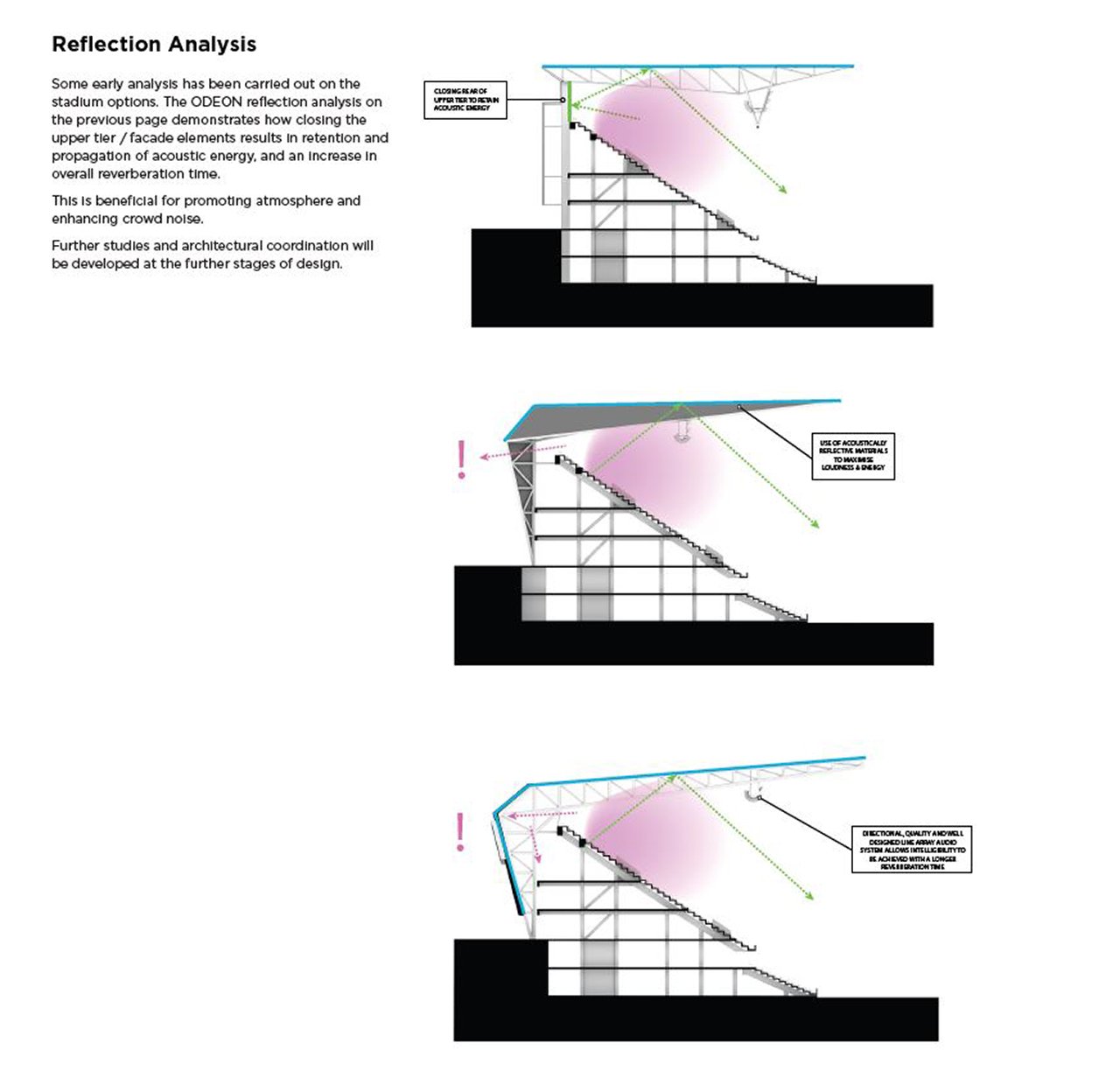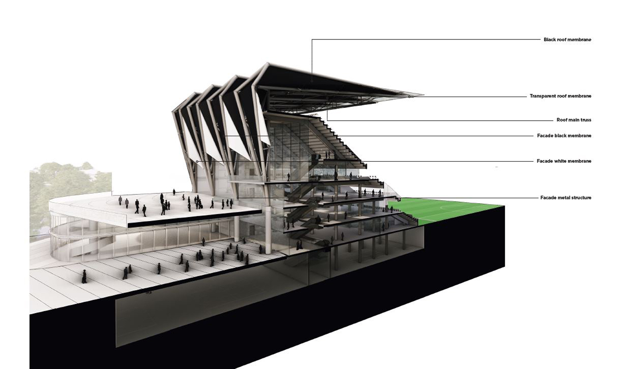 Ειδικότερα, σημεία προσέλευσης, χώροι στάθμευσης, στέγαστρα, όψεις, κερκίδες, σε συνδυασμό με τις απαιτούμενες ειδικές μελέτες (εκκένωση χώρων, συστημάτων επικοινωνίας κ.α.), προκειμένου να καλύπτουν τους στόχους για μια υπερσύγχρονη εγκατάσταση.