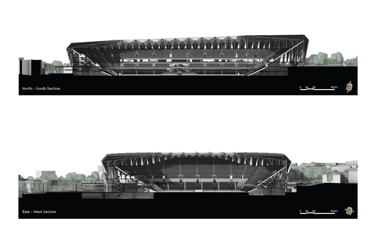 Εγκάρσιες αρχιτεκτονικές τομές του γηπέδου, κατά μήκος και κατά πλάτος