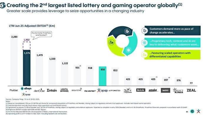 Η Allwyn, που σήμερα ελέγχει το 51,8% του ΟΠΑΠ, θα κατέχει πλέον το 78,5% του ενιαίου σχήματος, ενώ οι υφιστάμενοι ιδιώτες μέτοχοι θα διατηρήσουν το 21,5%. Με την ένωση των δυνάμεων τα EBITDA από τα 900 εκατ. ευρώ που είναι σήμερα του ΟΠΑΠ θα αναρριχηθούν στα 1,9 δισ. ευρώ.