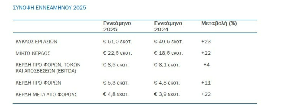 - Βελτίωση των κερδών προ φόρων κατά 11%, τα οποία ανήλθαν σε 5,3 εκατ. ευρώ για το ενεάμηνο του 2025 έναντι 4,8 εκατ. ευρώ την αντίστοιχη περίοδο του 2024.