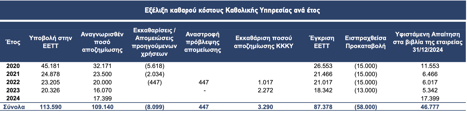 Τα υπόλοιπα ποσά, ωστόσο, της εκκαθάρισης (επιπλέον των 15 εκατ. κατ έτος) που υπολογίζονται από την Εθνική Επιτροπή Τηλεπικοινωνιών και Ταχυδρομείων, τα τελευταία χρόνια δεν έχουν καταβληθεί και οφείλονται. Σύμφωνα με τον τελευταίο δημοσιευμένο ισολογισμό του 2024 έχουν σωρευθεί 46,7 εκατ. ευρώ ως υφιστάμενη απαίτηση στα βιβλία της εταιρείας.