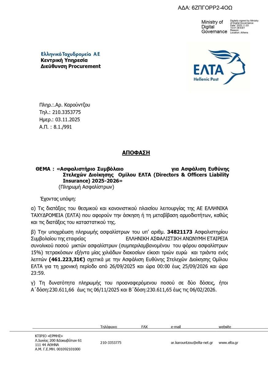 Πρόκειται για ασφάλιση ευθύνης στελεχών διοίκησης ομίλου ΕΛΤΑ για τη χρονική περίοδο από 26/09/2025 και ώρα 00:00 έως 25/09/2026 και ώρα 23:59. Δηλαδή καλύπτει τις τελευταίες 40 κρίσιμες μέρες του Γρηγόρη Σκλύκα στη διοίκηση των ΕΛΤΑ.