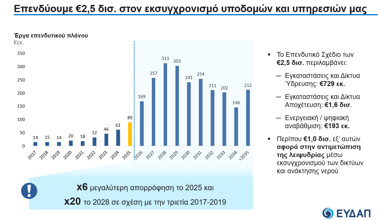 Ανάμεσά τους ξεχωρίζουν η κατασκευή υποδομών αποχέτευσης και επεξεργασίας λυμάτων στην Ανατολική Αττική, η επέκταση των αγωγών προς το Ελληνικό και η αναβάθμιση της Ψυτάλλειας.