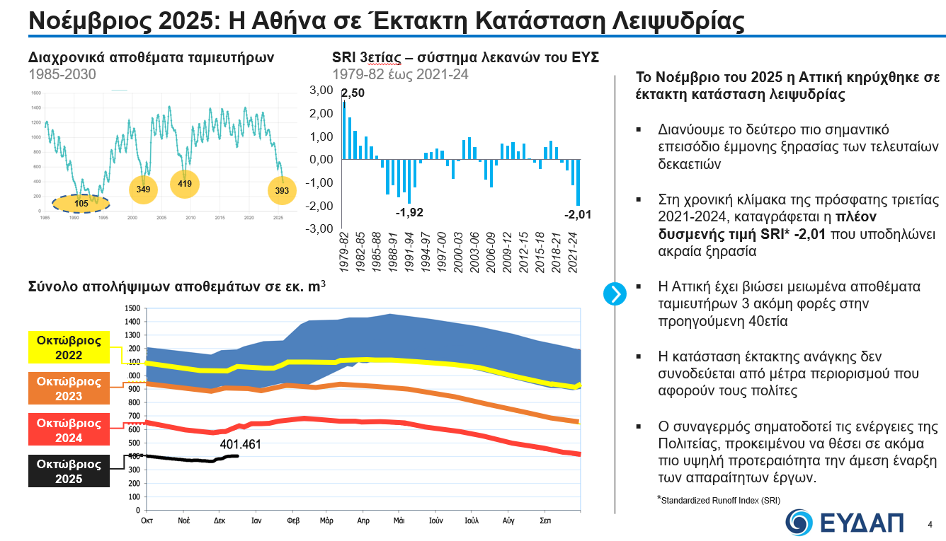 Παρά τις έντονες βροχοπτώσεις του φετινού φθινοπώρου, η Αττική συνεχίζει να βρίσκεται αντιμέτωπη με μία από τις σοβαρότερες κρίσεις υδατικών πόρων των τελευταίων δεκαετιών, καθώς τον Νοέμβριο του 2025 κηρύχθηκε επίσημα σε κατάσταση έκτακτης ανάγκης λόγω λειψυδρίας.