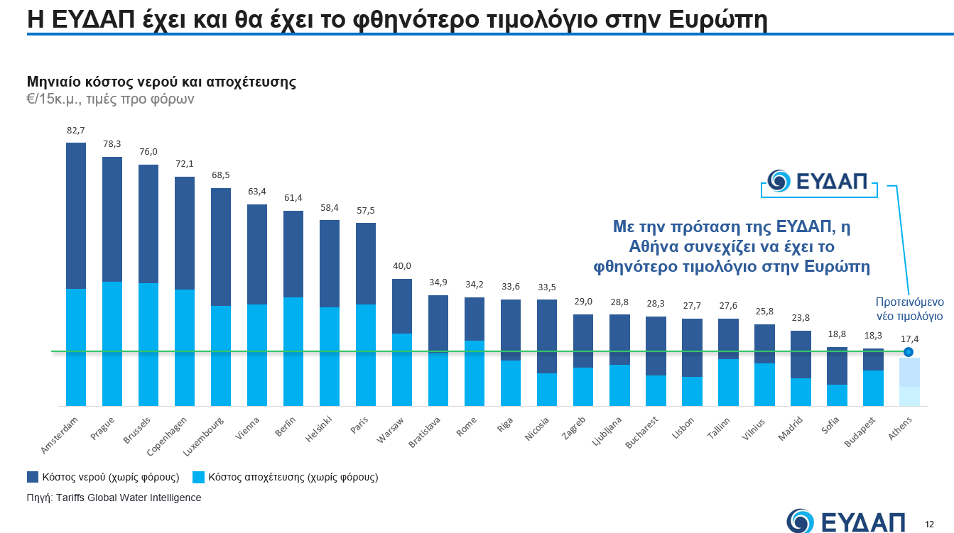 Παρά την προτεινόνενη αύξηση μετά απο 17 χρόνια, το τιμολόγιο νερού στην Αττική θα παραμείνει το φθηνότερο στην Ευρώπη, σύμφωνα με τα στοιχεία που παρουσίασε ο κ. Σαχίνης.