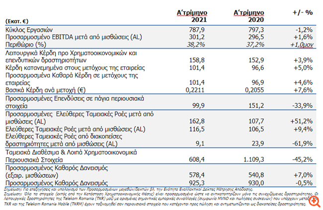 Για το 2021, η Διοίκηση αναμένει προσαρμοσμένες επενδύσεις ύψους €550 εκατ. περίπου, και προσαρμοσμένες ελεύθερες ταμειακές ροές €575 εκατ. περίπου. Οι ελεύθερες ταμειακές ροές θα ανέλθουν σε €480 εκατ. περίπου, αποτελώντας και τη συνολική Αμοιβή προς τους Μετόχους για το 2021 (μη συμπεριλαμβανομένων των εσόδων από την πώληση της Telekom Romania), μια αύξηση 20% σε σύγκριση με το προηγούμενο έτος.