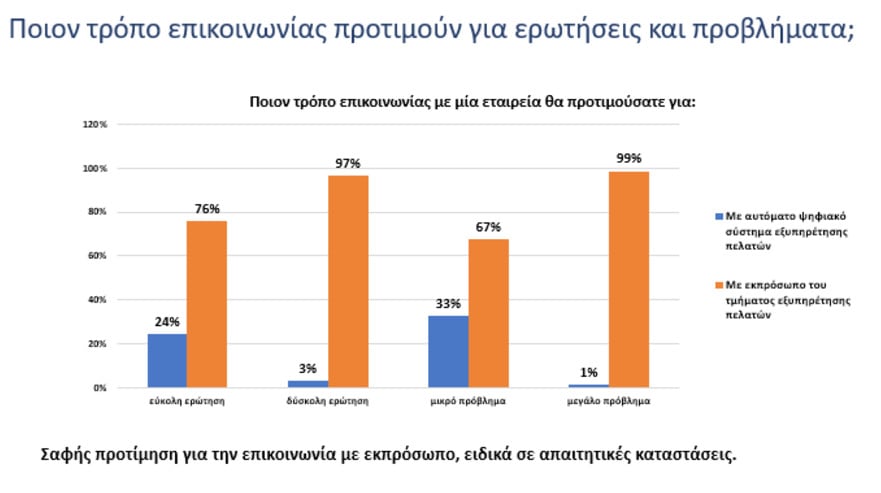 Οι καταναλωτές σε ποσοστό 92% θα προτιμούσαν προσωπική εξυπηρέτηση από μια εταιρεία, ενώ η πλειονότητα των ερωτηθέντων (66%) θα αντιδρούσε αρνητικά στην αποκλειστική χρήση ψηφιακών συστημάτων από μία εταιρεία για την εξυπηρέτηση των πελατών.