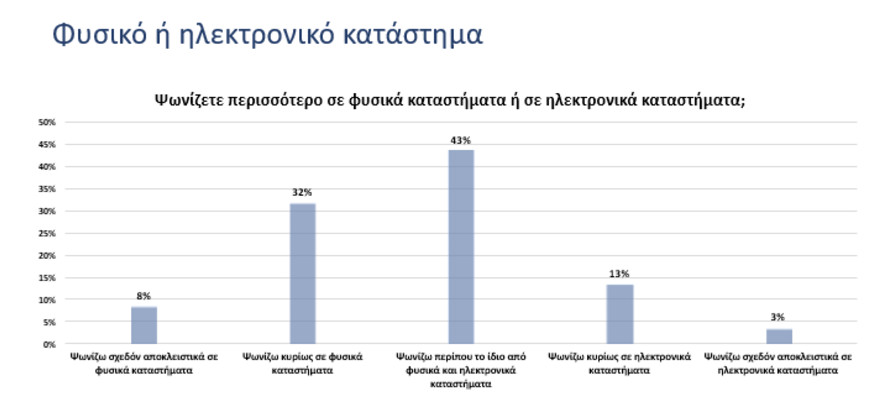 Στον τομέα του λιανεμπορίου, πολύ μεγάλο ποσοστό των καταναλωτών χρησιμοποιεί εξίσου και τα δύο κανάλια. Το ποσοστό αυτών που προτιμά πιο πολύ ή αποκλειστικά τα ηλεκτρονικά καταστήματα παραμένει χαμηλό.
