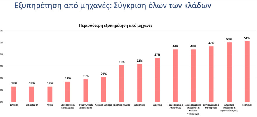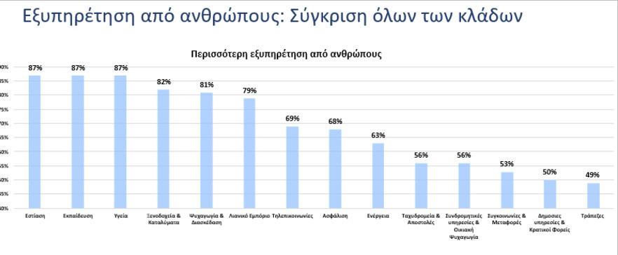 Μεταξύ άλλων, στους κλάδους της εστίασης, της φιλοξενίας, της ψυχαγωγίας και του λιανεμπορίου, ποσοστό των καταναλωτών άνω του 80% προτιμούν να έχουν περισσότερη εξυπηρέτηση από ανθρώπους.