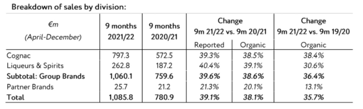Συνολικά ο όμιλος Remy Cointreau κατέγραψε στο εννεάμηνο της χρήσης 2021/2022 αύξηση οργανικών πωλήσεων κατά 38,1%, καθώς ανήλθαν σε €1,086 δισ. από €781 εκατ. το εννεάμηνο της χρήσης 2020/2021, ενώ ανοδικά κινείται ο τζίρος και σε σχέση με το αντίστοιχο διάστημα προ πανδημίας, στο 35,7%.