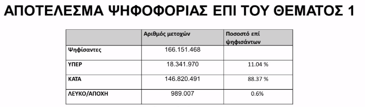 Ειδικότερα όπως ανακοινώθηκε από το προεδρείο υπέρ της πρότασης για μείωση μετοχικού κεφαλαίου ψήφισε το 11,03% των δικαιωμάτων ψήφου που συμμετέχουν στην ΓΣ, κατά ψήφισε το 88,37% και λευκό/αποχή το 0,6%.