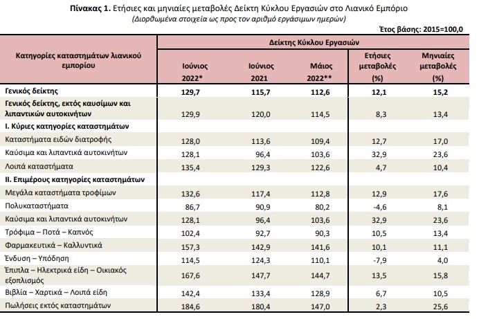 Συγκεκριμένα, ο Γενικός Δείκτης Κύκλου Εργασιών κατά τον μήνα Ιούνιο 2022, σε σύγκριση με τον αντίστοιχο δείκτη του Ιουνίου 2021, παρουσίασε αύξηση 12,1% και σε σύγκριση με τον αντίστοιχο δείκτη του Μαΐου 2022 αύξηση 15,2%.