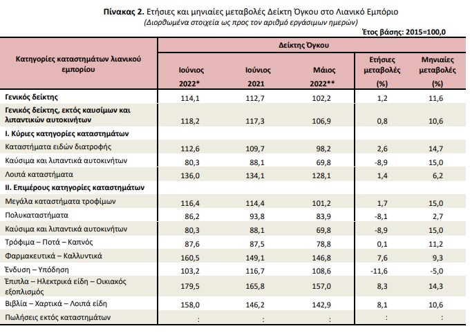 Ο Γενικός Δείκτης Όγκου (κύκλος εργασιών σε σταθερές τιμές), κατά τον μήνα Ιούνιο 2022, σε σύγκριση με τον αντίστοιχο δείκτη του Ιουνίου 2021, παρουσίασε αύξηση 1,2% και σε σύγκριση με τον αντίστοιχο δείκτη του Μαΐου 2022 αύξηση 11,6%.