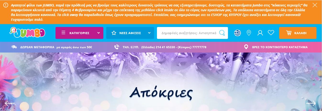 Συγκεκριμένα σε ανάρτηση στην επίσημη ιστοσελίδα της Jumbo αναφέρει επί λέξει: «Αγαπητοί φίλοι των JUMBO, παρά την πρόθεσή μας να βρούμε τους καλύτερους δυνατούς τρόπους να σας εξυπηρετήσουμε, δυστυχώς, τα καταστήματα Jumbo στις "κόκκινες περιοχές" θα παραμείνουν κλειστά από την Πέμπτη 4 Φεβρουαρίου και μέχρι την επέκταση της μεθόδου click inside σε όλο το εύρος των προϊόντων μας. Τα υπόλοιπα καταστήματα σε όλη την Ελλάδα θα λειτουργήσουν κανονικά. Τα click away θα παραδοθούν όπως έχουν προγραμματιστεί. Επιπλέον, σας ενημερώνουμε οτι το ESHOP της ΚΥΠΡΟΥ έχει ανοίξει και λειτουργεί κανονικά! Ευχαριστούμε πολύ».