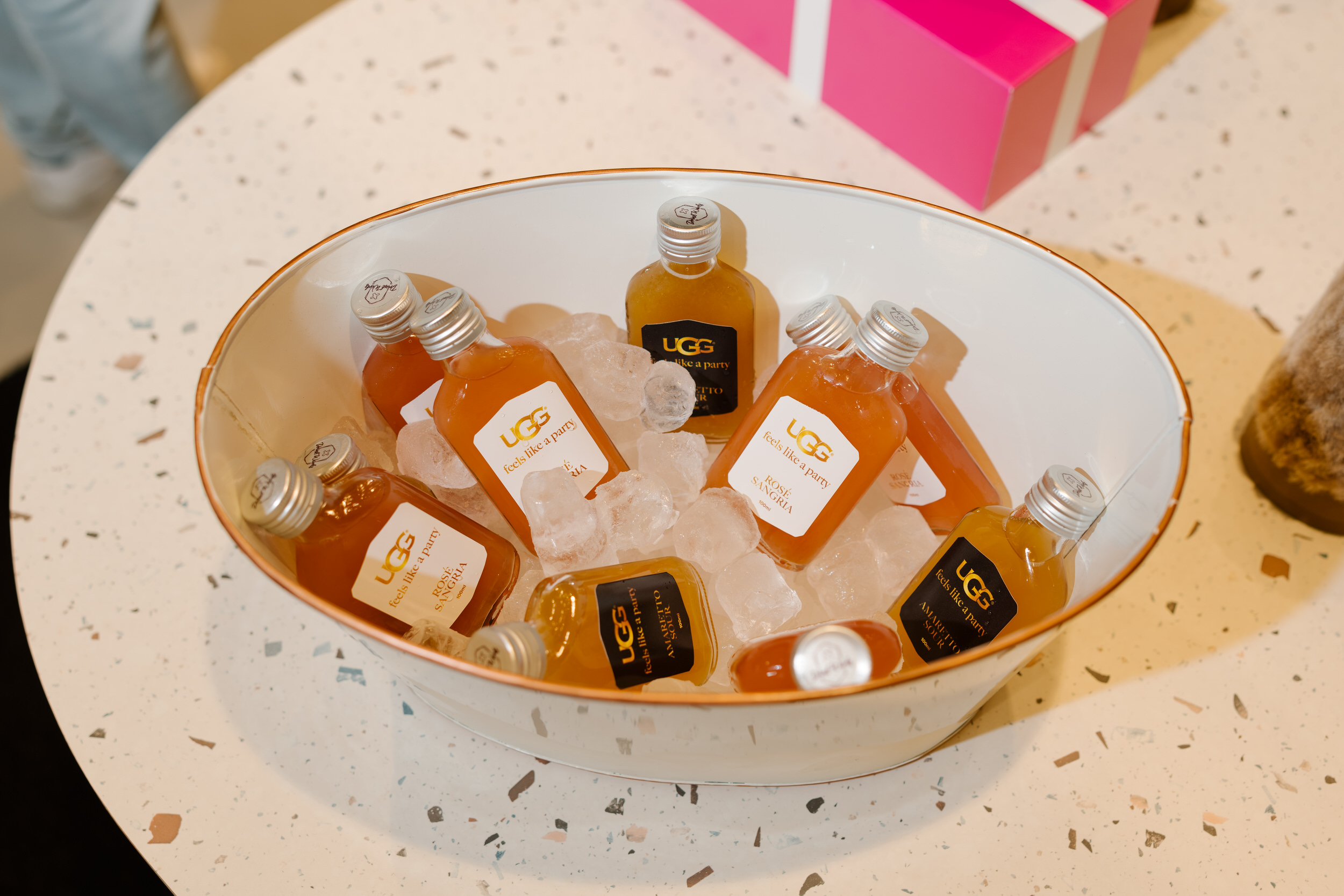 Στον πρώτο όροφο του καταστήματος, ανάμεσα στα αγαπημένα υποδήματα και τα εντυπωσιακά ρούχα του brand, στήθηκε ένα γιορτινό party με δυνατή μουσική, μπαλόνια και γευστικά cocktails που σερβίρονταν σε ατομικά, UGG-branded, μπουκαλάκια!
