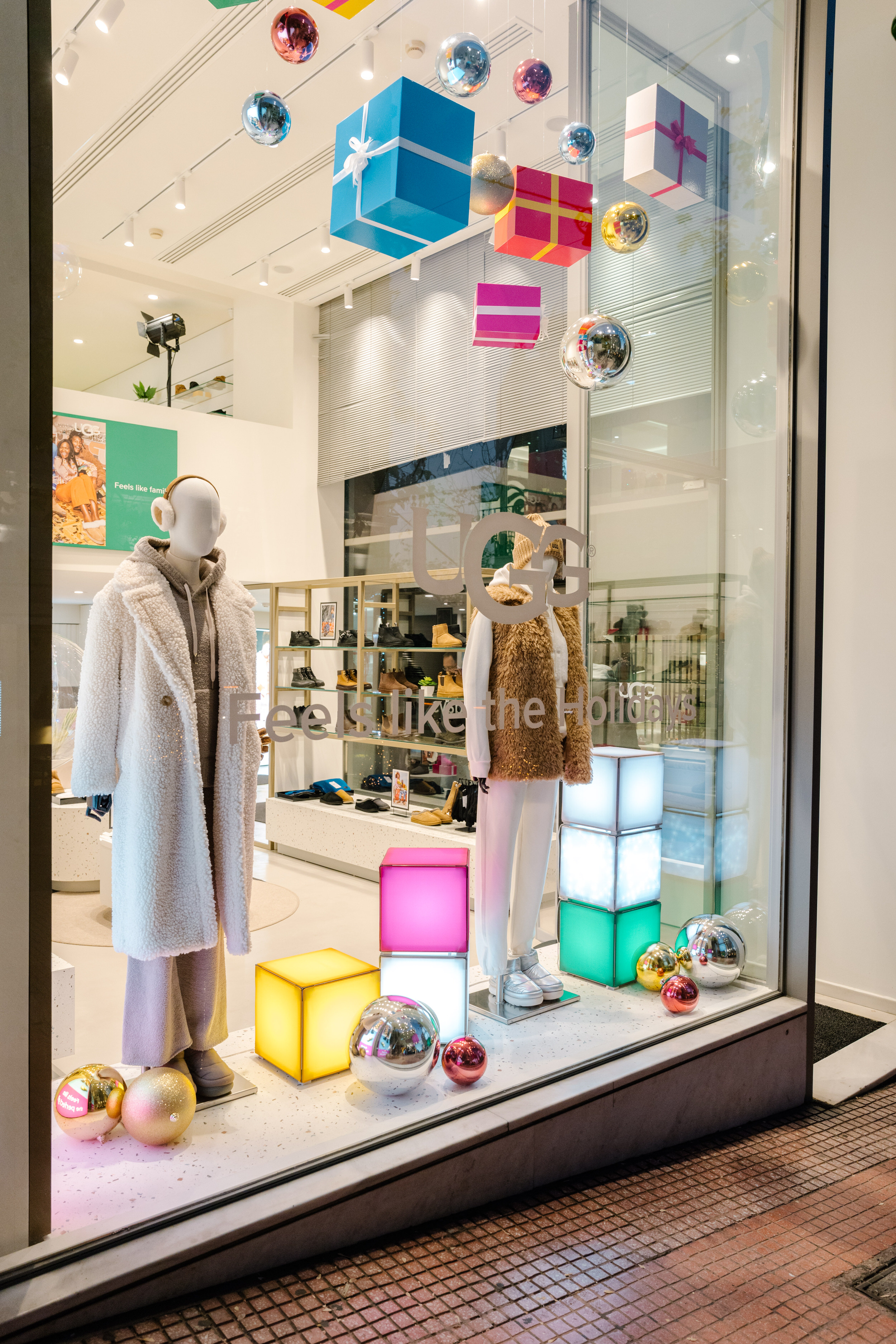 Ολα βασίστηκαν στην ιδέα της τρέχουσας Χριστουγεννιάτικης καμπάνιας του Οίκου «Feels Like The Holidays’», οπότε και ολόκληρο το κατάστημα μεταμορφώθηκε σε ένα γιορτινό σκηνικό. Στο ισόγειο του καταστήματος, η λαμπερή βιτρίνα με τις πολύχρωμες μπάλες και τις μπότες πρωταγωνιστές της φετινής σεζόν (Classic Ultra Mini / Classic Mini Platform / Classic Ultra Mini Platform / Neumel Platform / Classic Maxi Ultra Tall / Classic Maxi Mini), αποτέλεσε την απόλυτη είσοδο για το Χριστουγεννιάτικο event εντός του καταστήματος.