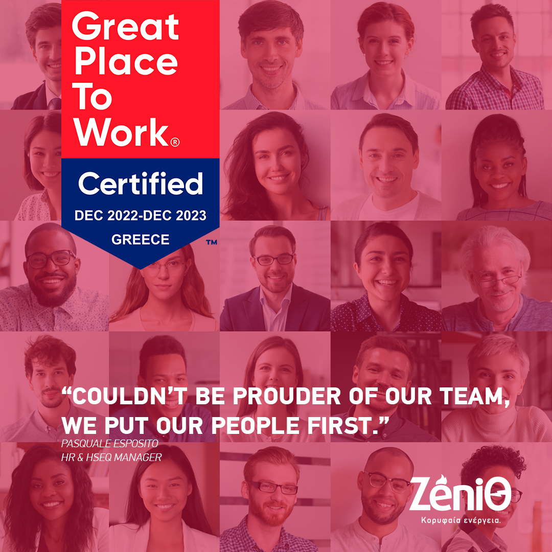 Με σύμμαχο την κορυφαία ενέργεια της ΖeniΘ, η εταιρεία παρέχει στους ανθρώπους της την ίδια ασφάλεια και αξιοπιστία που προσφέρει στους πελάτες της, μέσα από ένα υγιές εργασιακό περιβάλλον με εξαιρετικές συνθήκες εργασίας, απαλλαγμένο από κάθε είδους διακρίσεις. Η πιστοποίηση «Great Place to Work» επιβεβαιώνει τη βαθιά σχέση εμπιστοσύνης που έχει χτίσει με τους εργαζόμενους της και αντανακλά τον υψηλό βαθμό ικανοποίησής τους από την εταιρεία.