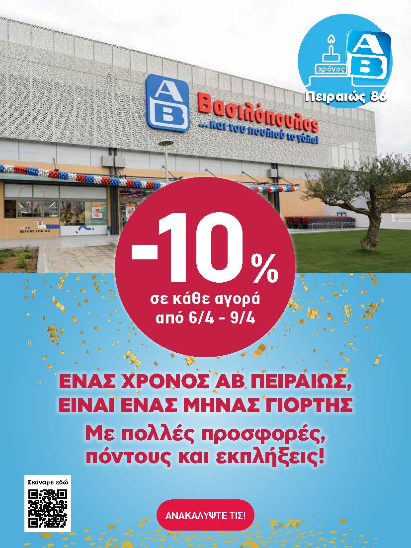 Επίσης, το κατάστημα διαθέτει άνετο υπόγειο 38 θέσεων, 5 ταμεία & 3 selfcheckoutταμεία για εύκολες αγορές. Εν όψει του Πάσχα, μάλιστα, οι επισκέπτες του καταστήματος μπορούν να επωφεληθούν των προσφορών:-50%ή 1+1δώρο προϊόντα σε επιλεγμένους κωδικούς, αλλά και επιπλέον να κερδίσουν 10% στις συνολικές αγορές τους. Οι προσφορές συνεχίζονται και μετά το Πάσχα με την ABplus στο προσκήνιο και ενέργειες με πολλούς πόντους και δυνατές προσφορές για να κερδίζεις 6ευρες επιταγές γρήγορα και εύκολα.