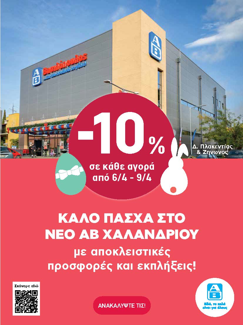 Έτσι, από τις 6 έως τις 9 Απριλίου οι πελάτες θα κερδίζουν 10%στις συνολικές τους αγορές ενώ από την ίδια μέρα έως και τις 15 του μήνα εντός του καταστήματος θα απολαύσουν αποκλειστικές προσφορές σε επιλεγμένα προϊόντα. Μετά το Πάσχα, η γιορτή συνεχίζεται με πολλές προσφορές, εκπλήξεις, δώρα και φυσικά πολλούς πόντους ΑΒ Plus για να κερδίζεις γρήγορα 6ευρες επιταγές. Φυσικά όλοι οι πελάτες θα κάνουν εύκολα τα ψώνια τους με τα selfcheckoutταμεία που διαθέτει το κατάστημα. Οι εκπλήξεις δεν σταματούν εδώ, καθώς έχει προγραμματιστεί για την Παρασκευή 7/4 ζωντανή μετάδοση από το κατάστημα σε συνεργασία με τον ραδιοφωνικό σταθμό ΡΥΘΜΟ 9,49. Η ζωντανή εκπομπή με την Μαρία Γεωργάκαινα θα διαρκέσει από τις 10:00 έως τις 13:00. Παράλληλα, θα υπάρχουν γευστικές δοκιμές στις 7 και 8 Απριλίου, αλλά και 13 και 14 Απριλίου, ενώ μικροί και μεγάλοι θα έχουν την ευκαιρία να πάρουν μικρά δωράκια.