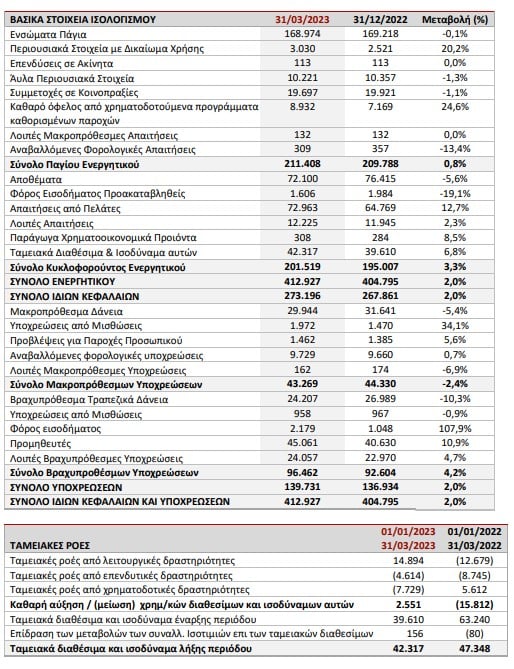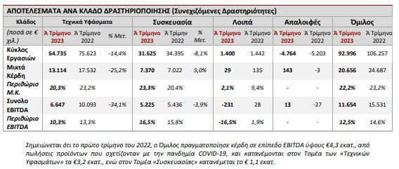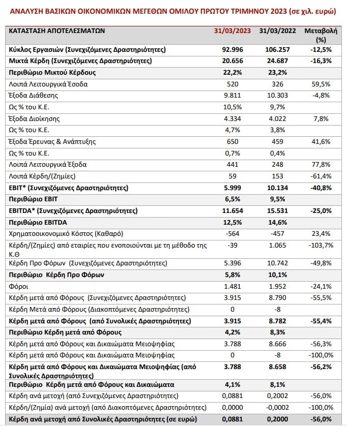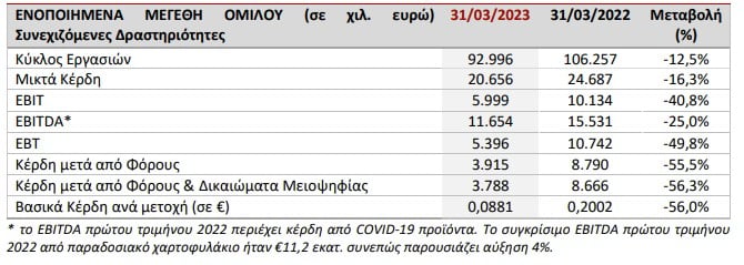 Ειδικότερα, στον πίνακα παρουσιάζονται τα βασικά οικονομικά μεγέθη του Ομίλου για το πρώτο τρίμηνο 2023, από συνεχιζόμενες δραστηριότητες, σε σχέση με το 2022: