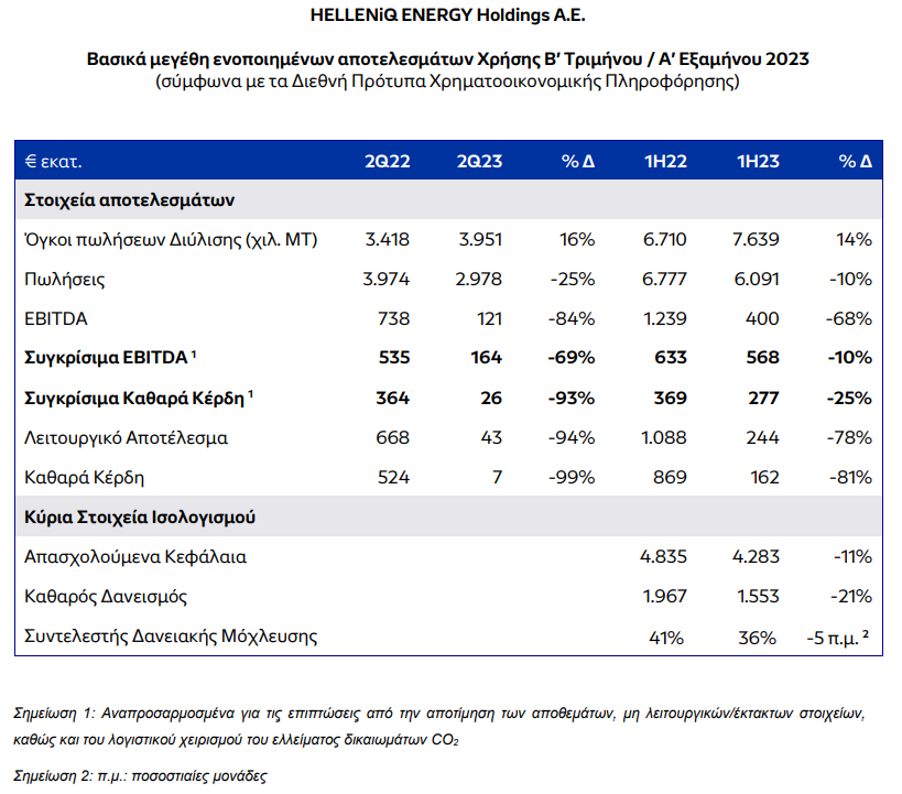 Η HELLENiQ ENERGY Holdings Α.Ε. («Εταιρεία») ανακοίνωσε τα ενοποιημένα οικονομικά αποτελέσματα Β' Τριμήνου 2023, με τα Συγκρίσιμα Κέρδη EBITDA να διαμορφώνονται στα €164 εκατ. και τα Συγκρίσιμα Καθαρά Κέρδη στα €26 εκατ.. Συνολικά για το Α’ Εξάμηνο, τα Συγκρίσιμα Κέρδη EBITDA ανέρχονται σε €568 εκατ. και τα Συγκρίσιμα Καθαρά Κέρδη σε €277 εκατ., καταγράφοντας μια ακόμα θετική επίδοση του Ομίλου. Σημειώνεται ότι στα λειτουργικά αποτελέσματα δεν συμπεριλαμβάνονται τα αποτελέσματα ELPEDISON και ΔΕΠΑ που ενοποιούνται με τη μέθοδο της καθαρής θέσης.