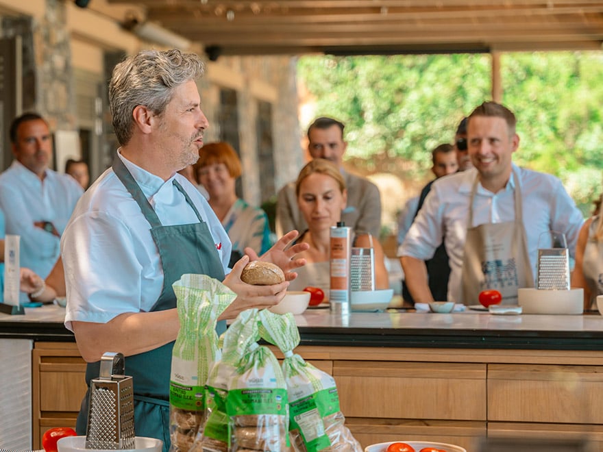 Κατά τη διάρκεια της εκδήλωσης, ο σεφ μίλησε σε εκπροσώπους των μέσων αλλά και σε συνεργάτες της Lidl Ελλάς και του Daios Cove για τη σπουδαία γαστρονομική κληρονομιά της Κρήτης, ενώ παράλληλα έδειξε σε όλους, με κάθε λεπτομέρεια, πώς φτιάχνεται ένας αυθεντικός κρητικός ντάκος.