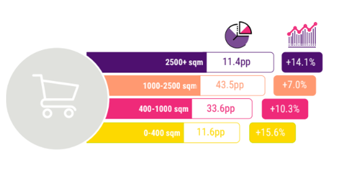 Τέλος, αναλύοντας την εικόνα ανά μέγεθος καταστήματος, εξακολουθούν να ξεχωρίζουν τα hyper markets (με ανάπτυξη 14,1%), τα οποία πρωταγωνίστησαν την τελευταία τριετία, χάρη κυρίως στους μεγαλύτερους χώρους τους αλλά και τη σαφώς μεγαλύτερη ποικιλία σε κωδικούς προϊόντων. Ωστόσο, εδώ και αρκετούς μήνες εμφανίζουν διψήφια ποσοστά ανόδου (άγγιξαν το 16%) και τα πολύ μικρά καταστήματα.