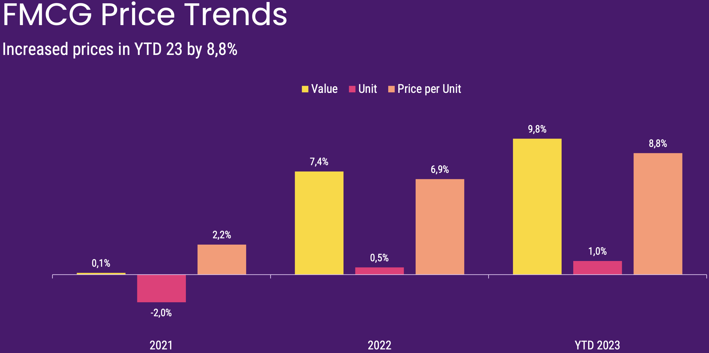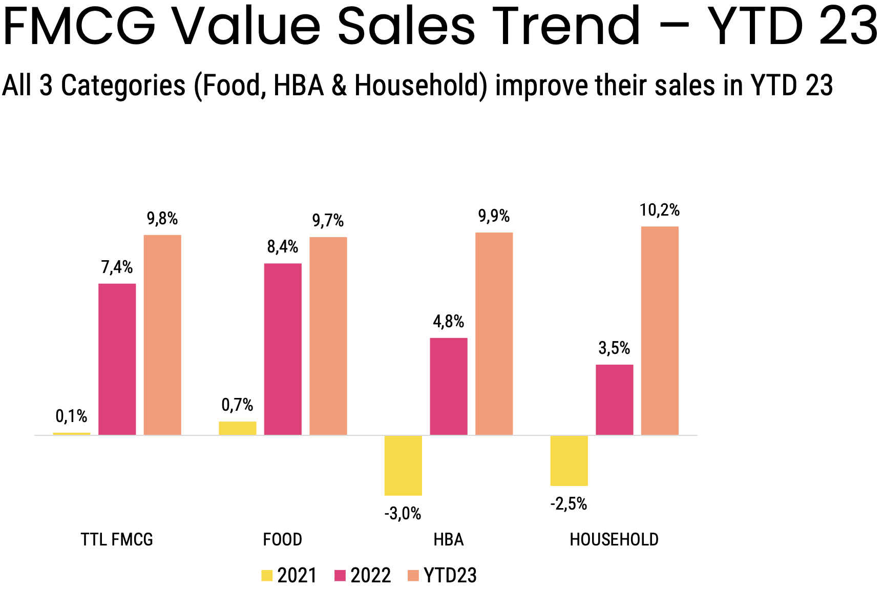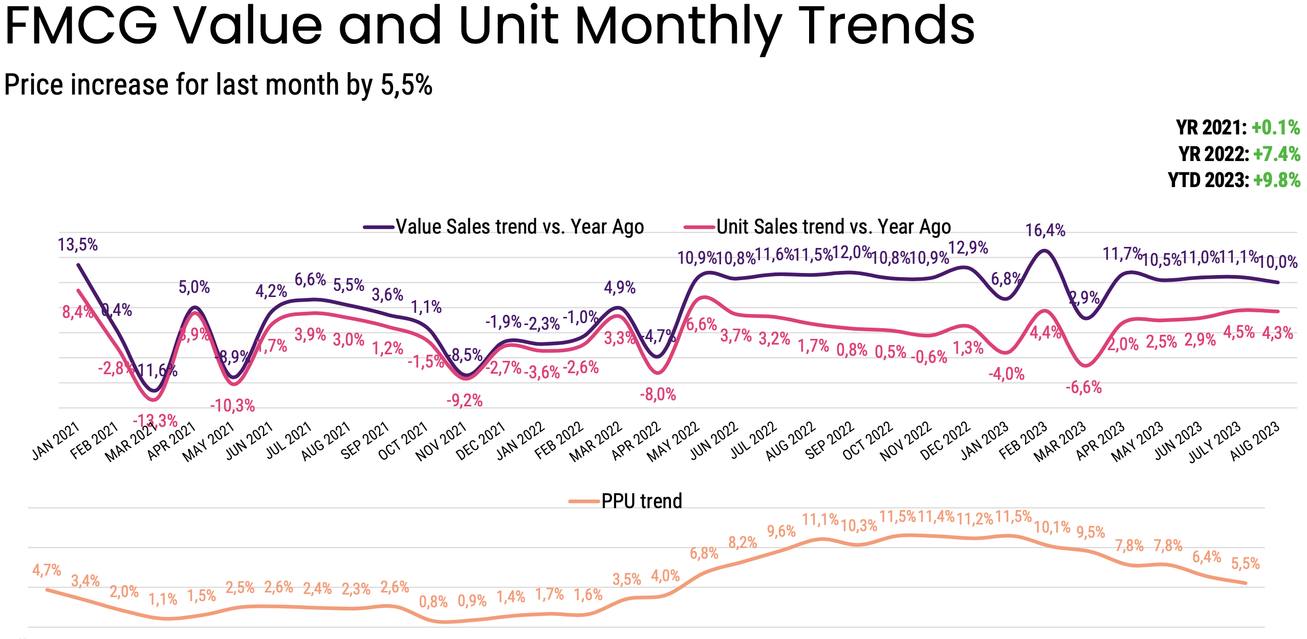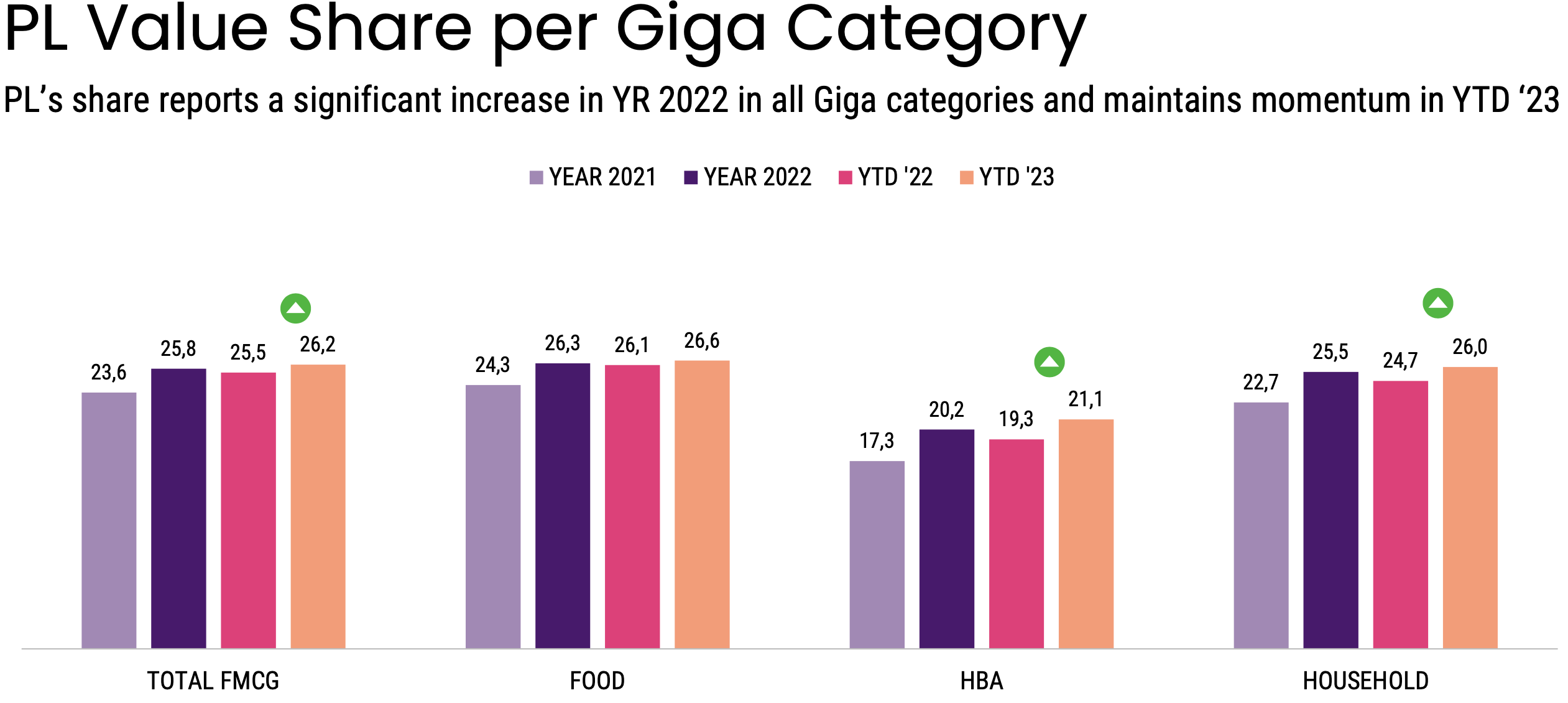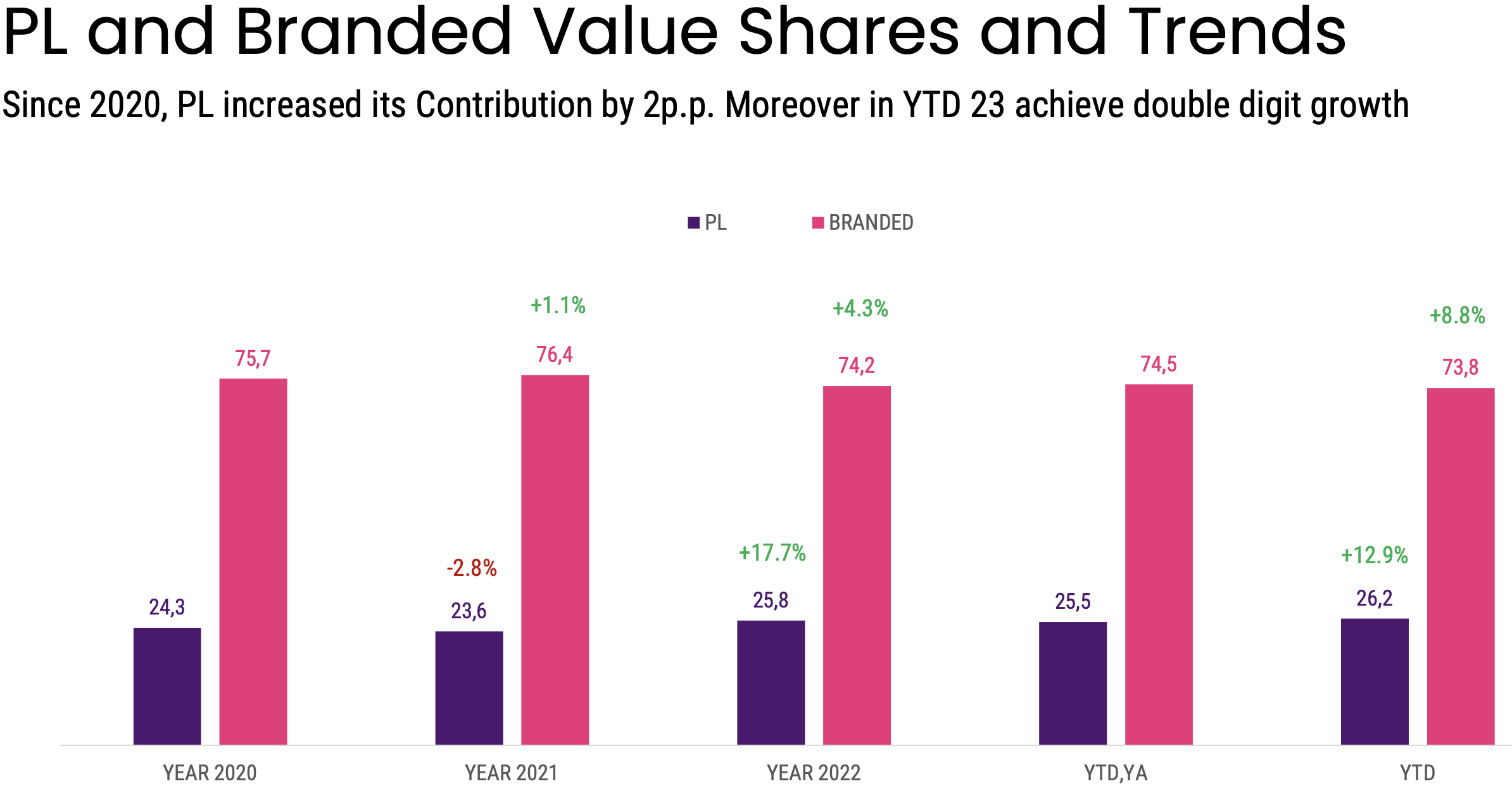 Συνεχίστηκε η υπεραπόδοση της κατηγορίας των προϊόντων ιδιωτικής ετικέτας έναντι των επώνυμων brands. Ολοκλήρωσαν το οκτάμηνο του 2023 με ανάπτυξη 12,9% (έναντι 8,8% των branded) και συνολικό μερίδιο αγοράς 26,2%.