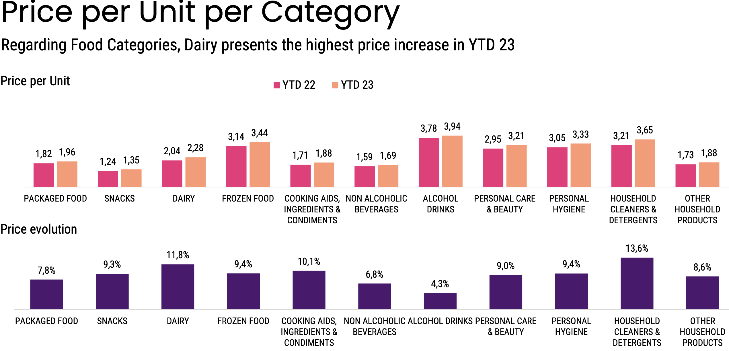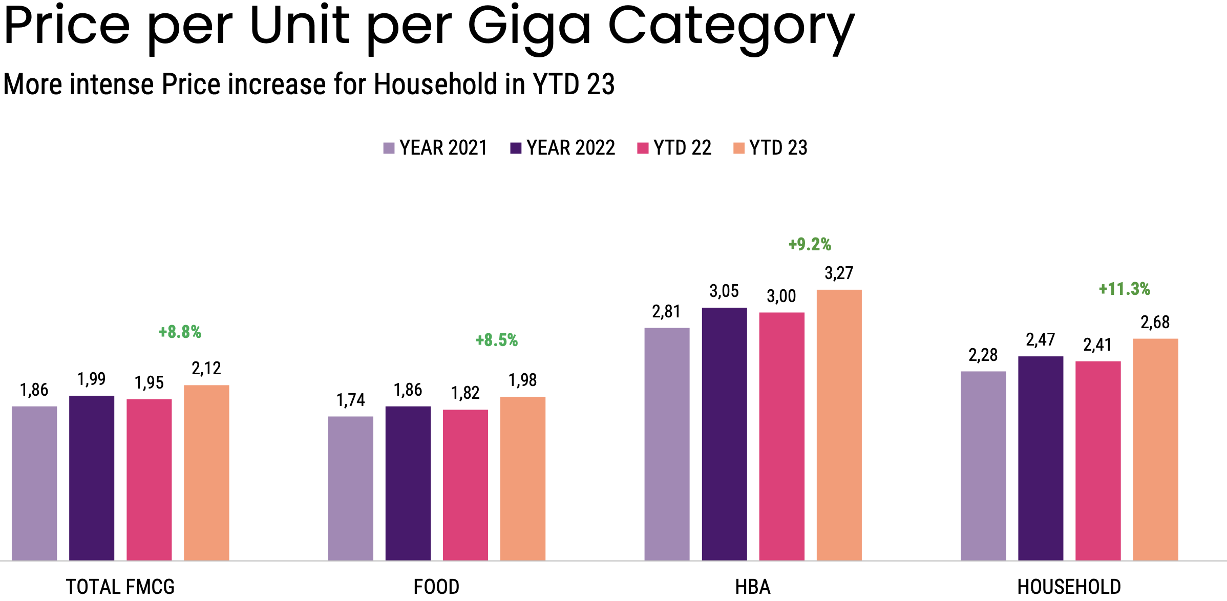 Η τιμή ανά μονάδα προϊόντος ενισχύθηκε κατά μέσο όρο 8,8% ελαφρώς χαμηλότερα από τους ρυθμούς στο επτάμηνο (9,2%), αλλά υψηλότερα από τις ανατιμήσεις το 2022 (+6,9%) και ενώ είχαν προηγηθεί μέσες αυξήσεις 2,2% το 2021.