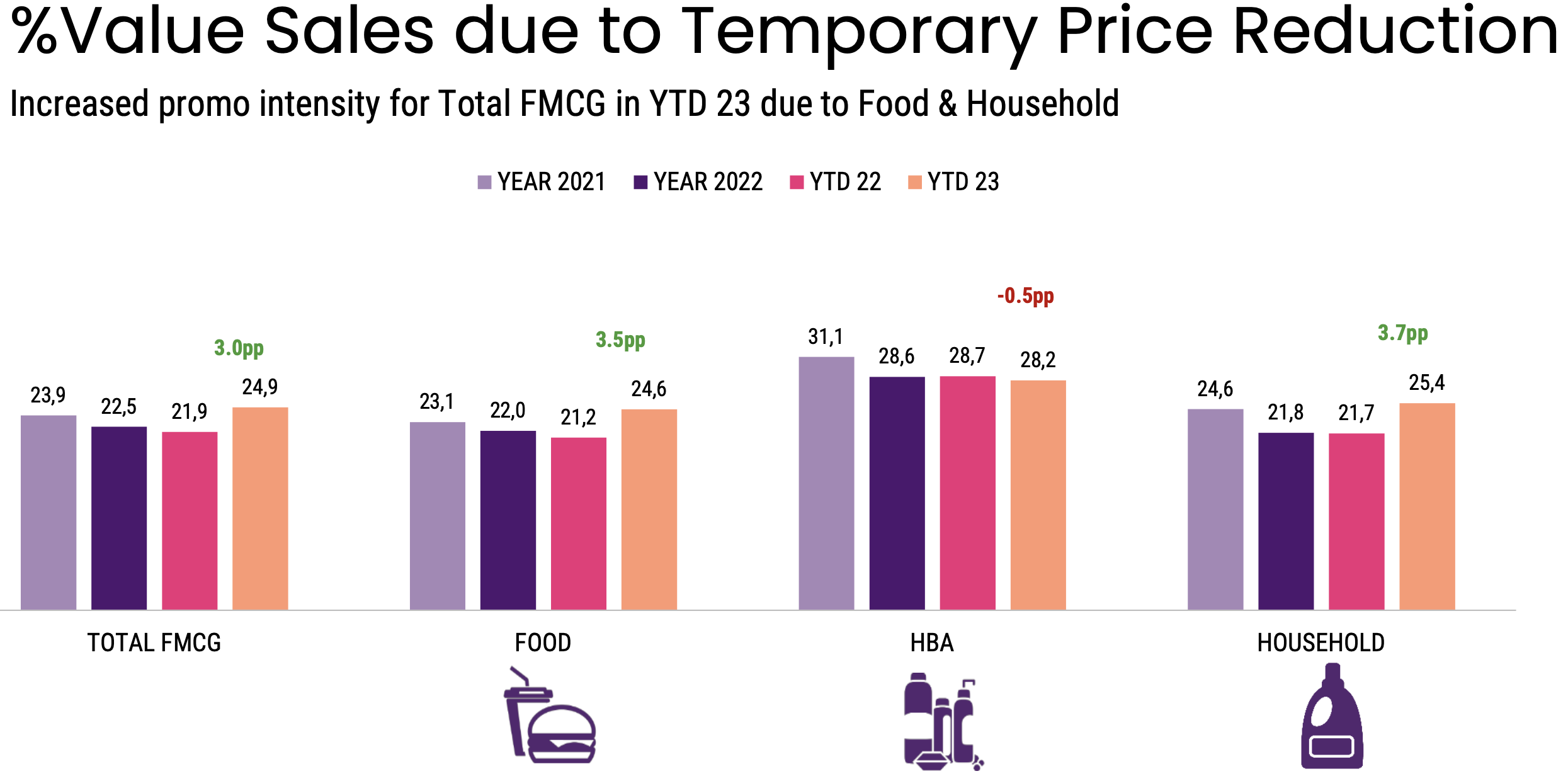 Οι προσφορές (promo) ενισχύθηκαν στους ταχυκίνητους κωδικούς (FMCG) κατά 3 pp, αν και στα προϊόντα προσωπικής φροντίδας και υγιεινής υποχώρησαν.
