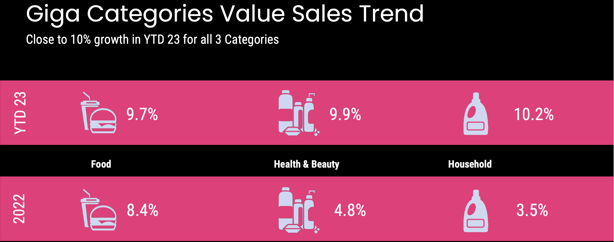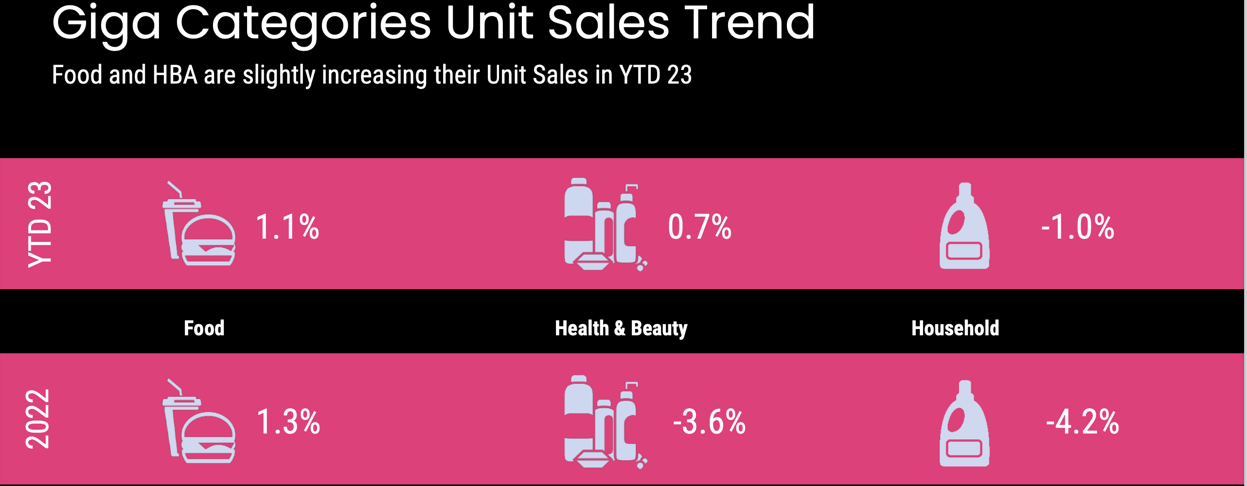 Σε επίπεδο σταθερού barcode, οι giga κατηγορίες εμφάνισαν σημαντική ανάπτυξη σε αξία, ωστόσο σε όρους όγκου μόνο τα προϊόντα για το σπίτι υποχώρησαν κατά 1,1%.