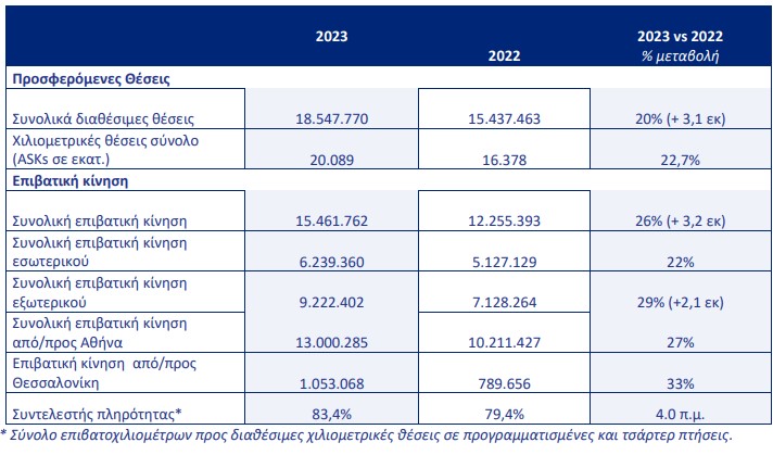 Νέοι προορισμοί, όπως το Ντουμπάι, το Ίνσμπρουκ και η Μπρατισλάβα, αλλά και η διατήρηση θερινών δρομολογίων (από την Αθήνα προς το Μπρίστολ, τη Μάλαγα, το Μπιλμπάο, το Ταλίν, τη Ρίγα, την Τυνησία, αλλά και προς τη Βαρκελώνη από τη Θεσσαλονίκη) κατά τη χειμερινή περίοδο, είχαν ως αποτέλεσμα την αύξηση των χιλιομετρικών θέσεων κατά 23%, ξεπερνώντας τα 20 δισ. χιλιομετρικές θέσεις σε σχέση με το 2022.