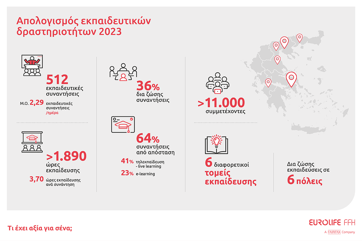 Η επένδυση της εταιρείας στο κομμάτι της εκπαίδευσης είναι κάτι που καταδεικνύεται για ακόμα μια φορά μέσα από τους αριθμούς. Μέσα στο 2023, η Eurolife FFH πραγματοποίησε περισσότερες από 510 εκπαιδευτικές συναντήσεις, αυξάνοντας το ποσοστό αυτό κατά 9,6% σε σχέση με το 2022. Ο αριθμός των συμμετεχόντων αυξήθηκε επίσης κατά 3,2% σε σχέση με το 2022, ξεπερνώντας τους 11.000, ενώ ο συνολικός αριθμός των ωρών εκπαίδευσης ξεπέρασε τις 1.890 ώρες, ποσοστό επίσης αυξημένο σε σχέση με την προηγούμενη χρονιά, κατά 21,2%.