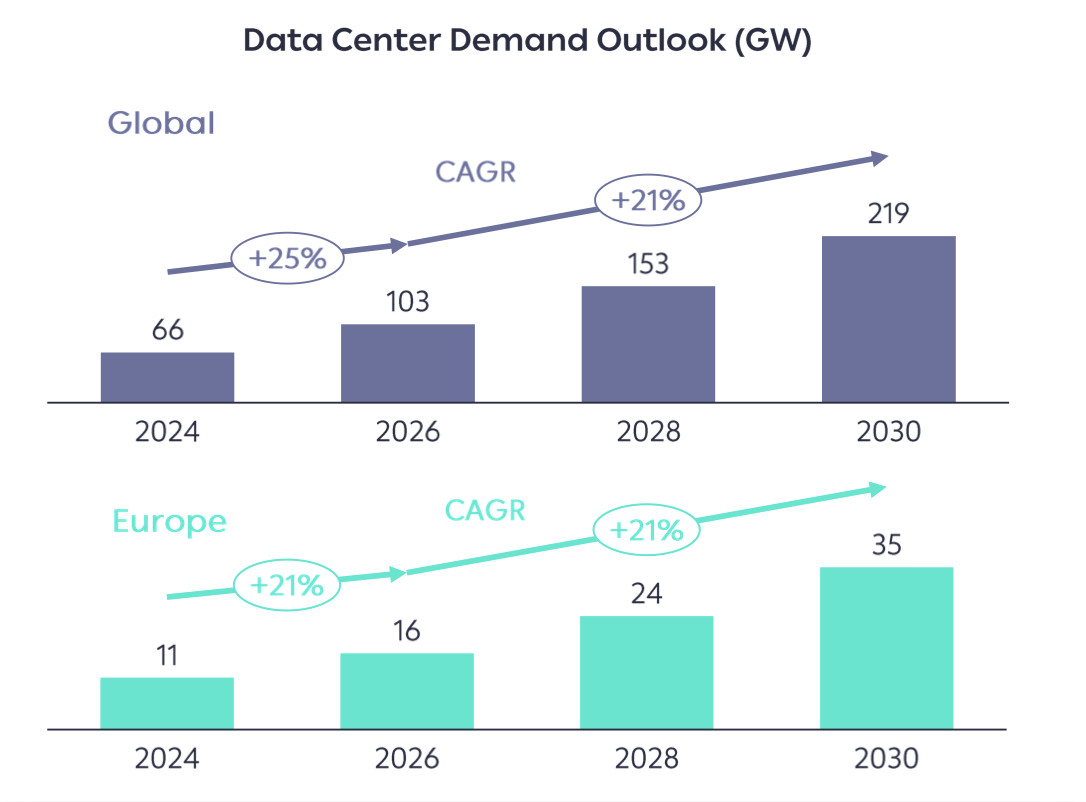 Σβήνοντας οριστικά τα φουγάρα του λιγνίτη εντός του 2026, η ΔΕΗ έχει σχεδιάσει την επόμενη μέρα, στοχεύοντας να τοποθετηθεί εγκαίρως σε μια αγορά που θα ανοίξει δυναμικά μέχρι το 2030, με τις εκτιμήσεις να κάνουν λόγο για αύξηση της ζήτησης στην Ευρώπη για data centers κατά 21% την επόμενη 5ετία (στα 35GW). Παρόλα αυτά τα ανακοινωμένα project αυτή τη στιγμή είναι πολύ μικρότερης δυναμικότητας.