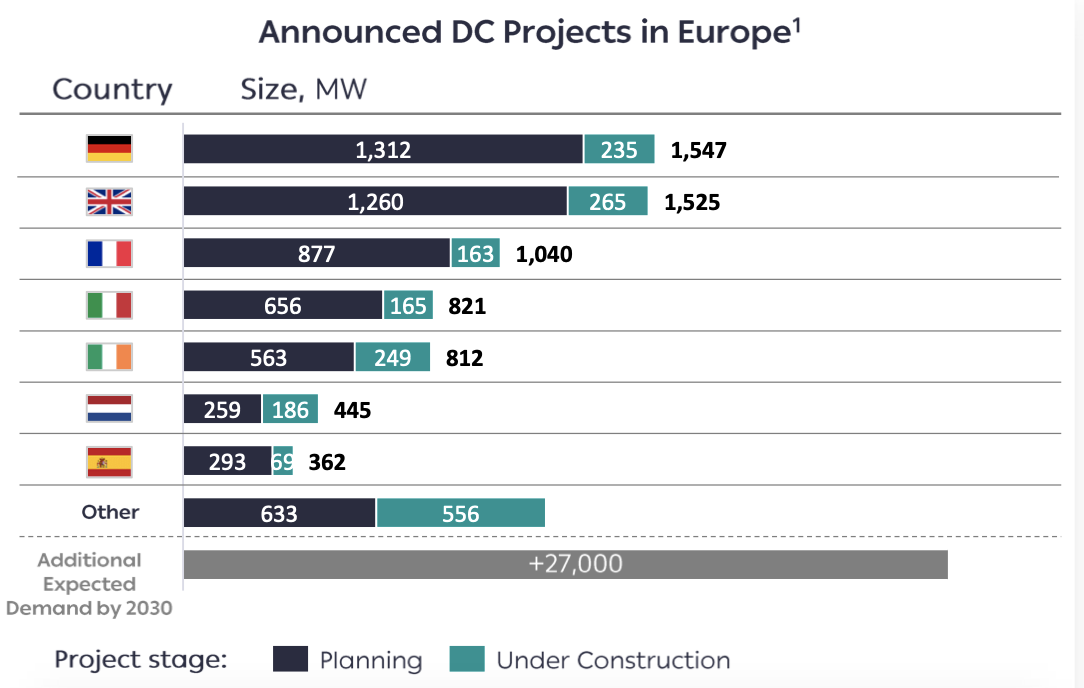 Παρότι όμως είναι δεδομένο ότι θα υπάρξει αυξανόμενη ζήτηση τα σχέδια για data centers στην Ευρώπη δεν ξεπερνούν τα 7-8 GW, γιατί δεν υπάρχουν κατάλληλα σημεία, που να συνδυάζουν όλες τις προϋποθέσεις που απαιτούνται για τη δημιουργία Mega Data Center.