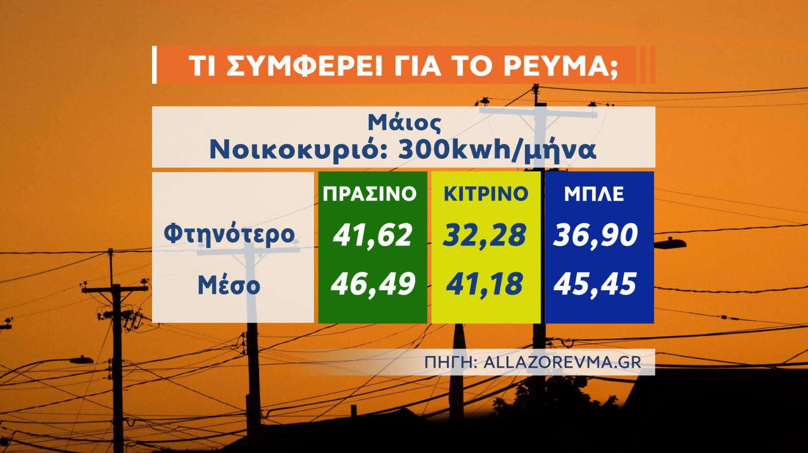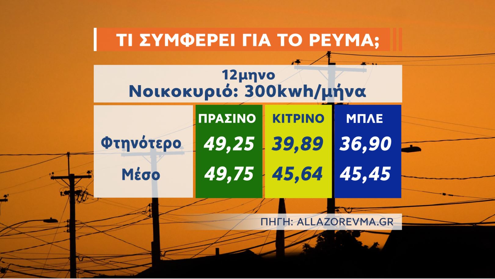 Σύμφωνα με τα πρόσφατα συγκριτικά στοιχεία που συγκέντρωσε η πλατφόρμα σύγκρισης τιμών allazorevma.gr, νοικοκυριό με μια τυπική κατανάλωση (300kWh το μήνα)
