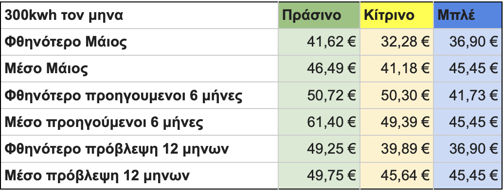 - Aπό τα στοιχεία του πίνακα προκύπτει ότι τα σταθερά τιμολόγια (μπλε) διατηρούν σταθερό και σχετικά χαμηλό μέσο όρο σε βάθος χρόνου, ενώ τα μεταβλητά (πράσινο και κίτρινο) εμφανίζουν μεγαλύτερη διακύμανση. Η στήλη με το χαμηλότερο κόστος για τον Μάιο αφορά τα κίτρινα τιμολόγια, ωστόσο η μακροχρόνια πρόβλεψη δείχνει σταθερό πλεονέκτημα σταθερών επιλογών.