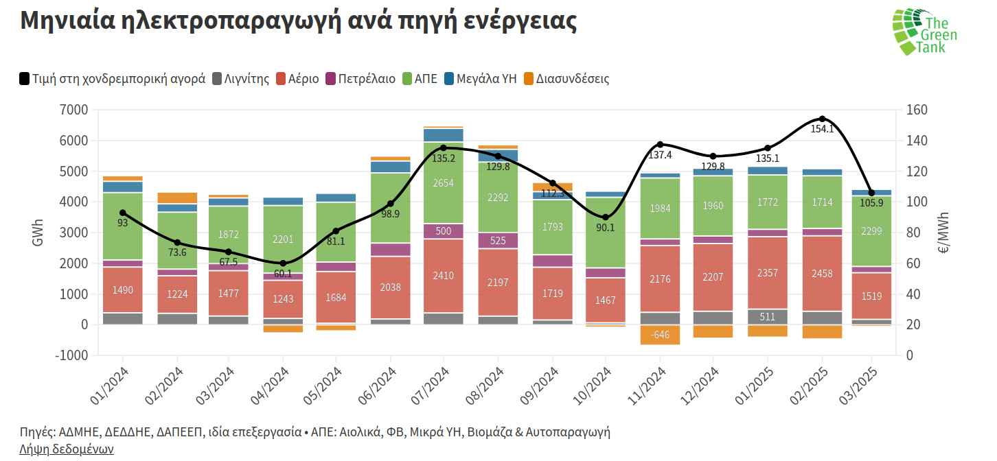 Η καθαρή ενέργεια (ΑΠΕ, υδροηλεκτρικά, βιομάζα, αυτοπαραγωγή) παρέμεινε κάτω από τα επίπεδα των ορυκτών καυσίμων, όπως και τον Φεβρουάριο.