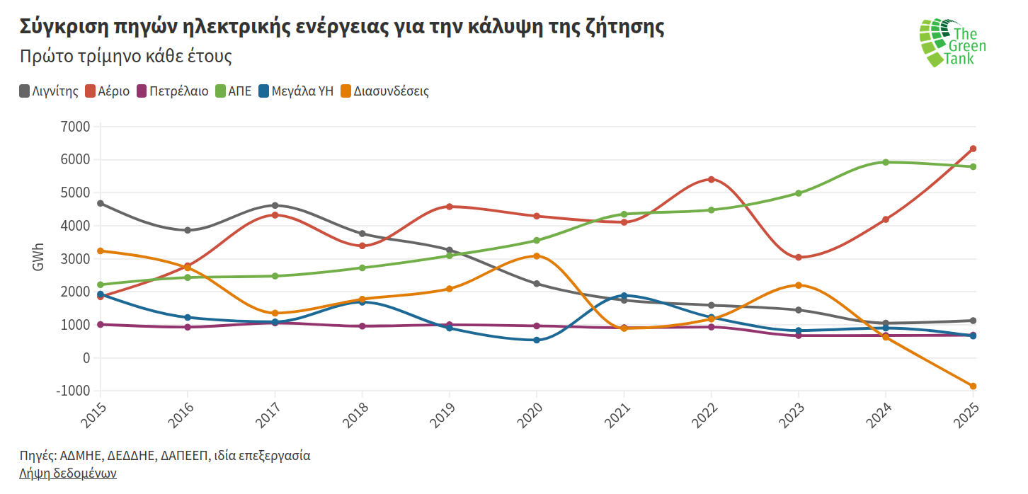 Ο λιγνίτης ανέβηκε στην τρίτη θέση με 1.127 GWh, εμφανίζοντας άνοδο σε σχέση με το πρώτο τρίμηνο του 2024. Τα μεγάλα υδροηλεκτρικά, λόγω μειωμένης παραγωγής, περιορίστηκαν στην τέταρτη θέση, πίσω ακόμη και από το πετρέλαιο, το οποίο με 687 GWh επέστρεψε στην τρίτη θέση για πρώτη φορά από το 2020.