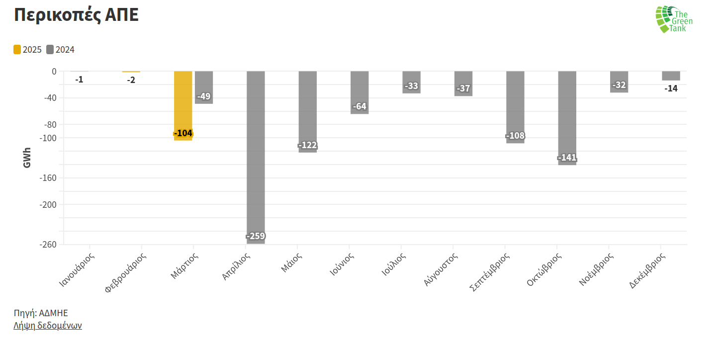 Συγκεκριμένα, σύμφωνα με στοιχεία που επεξεργάστηκε το The Green Tank, τον Μάρτιο σημειώθηκε μείωση της ζήτησης κατά 5,8%, ενώ η παραγωγή από ΑΠΕ διαμορφώθηκε στις 2.299 GWh. Ωστόσο, οι περικοπές ενέργειας από ΑΠΕ για τη διασφάλιση της ευστάθειας του συστήματος ανήλθαν σε 104 GWh (έναντι 49 GWh το 2024).