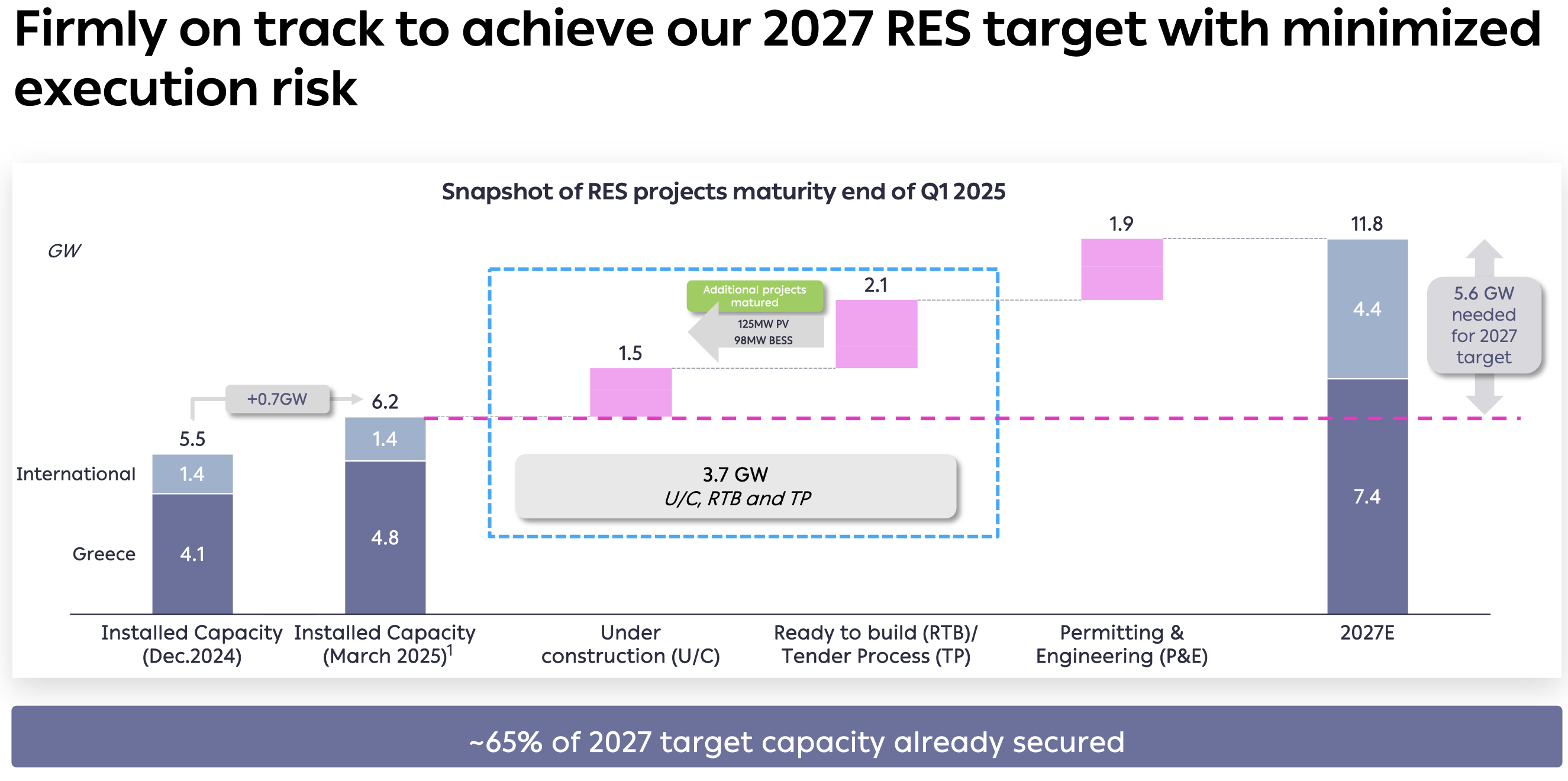 Εμβληματικό έργο αποτελεί ο φωτοβολταϊκός σταθμός 490 MW στη Μεγαλόπολη, η δεύτερη φάση του οποίου (125 MW) ξεκίνησε τον Μάρτιο. Η τρίτη φάση των 240 MW αναμένεται να εκκινήσει το 2026. Παράλληλα, η εταιρεία ξεκίνησε την κατασκευή δύο νέων σταθμών αποθήκευσης ενέργειας (BESS): «Μελίτη 1» (48 MW / 96 MWh) και «Πτολεμαΐδα 4» (50 MW / 100 MWh). Συνολικά, το πλάνο 2025–2027 περιλαμβάνει 600 MW έργων αποθήκευσης σε διάφορα στάδια ανάπτυξης.