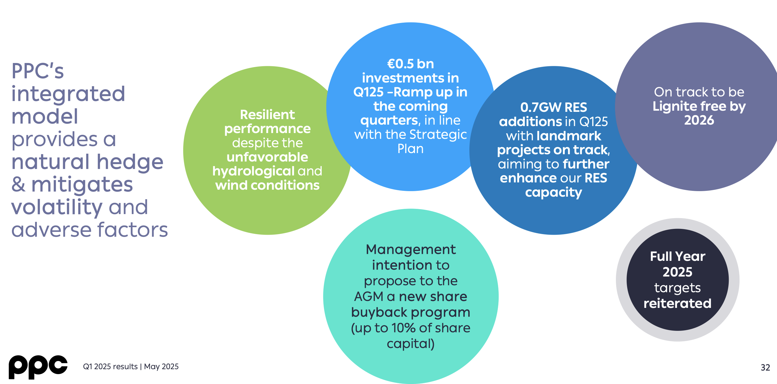Αυτή η στρατηγική ήδη αποδίδει καρπούς, καθώς στο πρώτο 3μηνο του 2025, παρά τις μη ευνοϊκές υδρολογικές και ανεμολογικές συνθήκες, η ΔΕΗ κατέγραψε ανθεκτικά αποτελέσματα και προσαρμοσμένο EBITDA €453 εκατ. Η παραγωγή από ΑΠΕ έφτασε το 27% του συνολικού μείγματος, ενώ συνεχίζεται η πορεία για πλήρη απεξάρτηση από τον λιγνίτη έως το 2026.