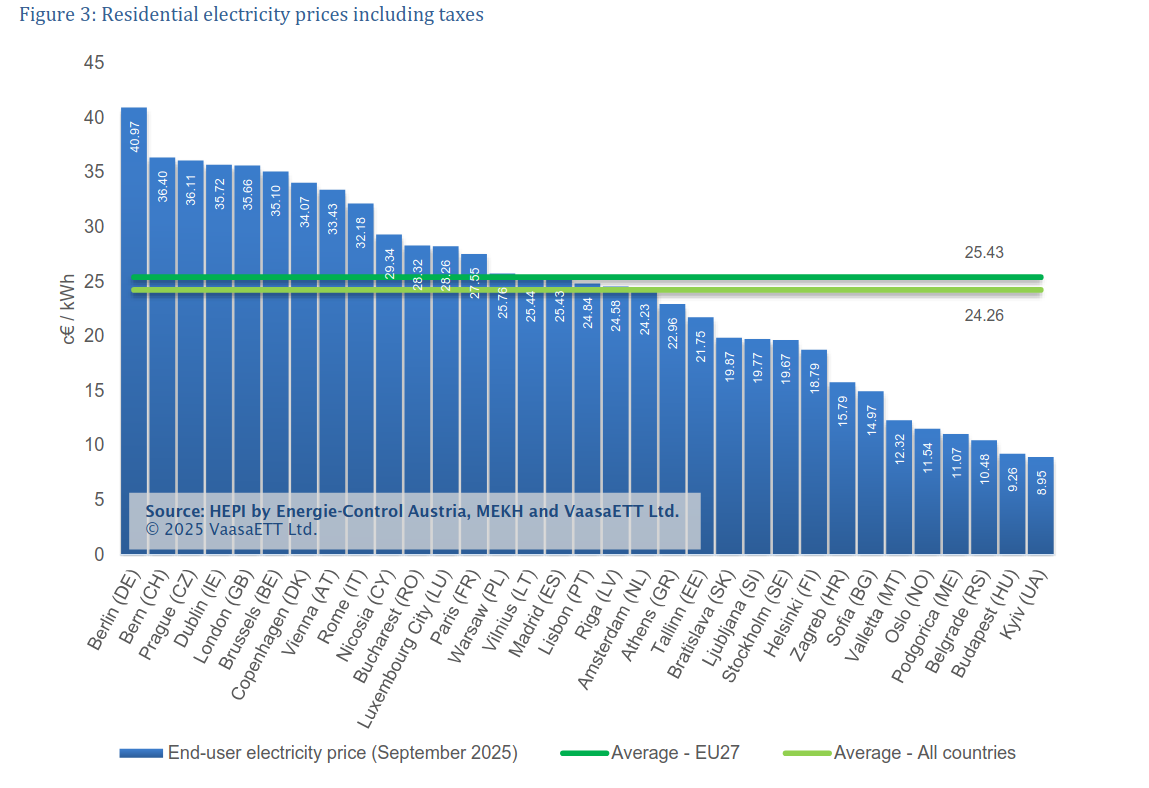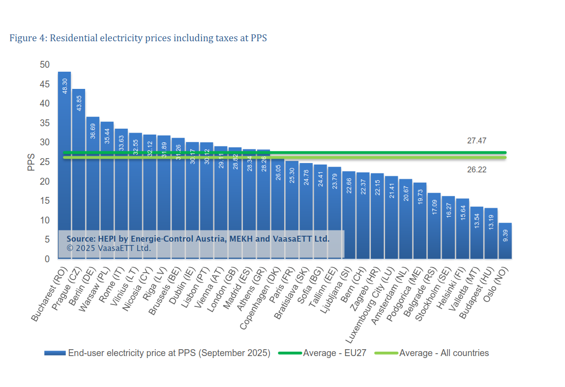 Όπως δείχνουν τα στοιχεία του Δείκτη Τιμών Ενέργειας Νοικοκυριών (Household Energy Price Index – HEPI), που συγκρίνει το ονομαστικό και το πραγματικό (με βάση την αγοραστική δύναμη) κόστος της κιλοβατώρας στις ευρωπαϊκές πρωτεύουσες, στην Αθήνα η τιμή ρεύματος – συμπεριλαμβανομένων φόρων, ΦΠΑ και ρυθμιζόμενων χρεώσεων – βρισκόταν τον Σεπτέμβριο στα 0,23 €/kWh, γεγονός που την κατέτασσε στη 20ή θέση ανάμεσα σε 33 πόλεις.