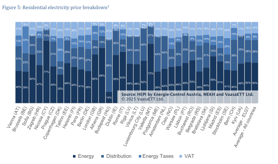 - Στη Βουδαπέστη, αντίθετα, η ενέργεια αποτελούσε μόλις το 14% του κόστους, με τα τέλη διανομής να φθάνουν το 65% και τον ΦΠΑ το 21%.