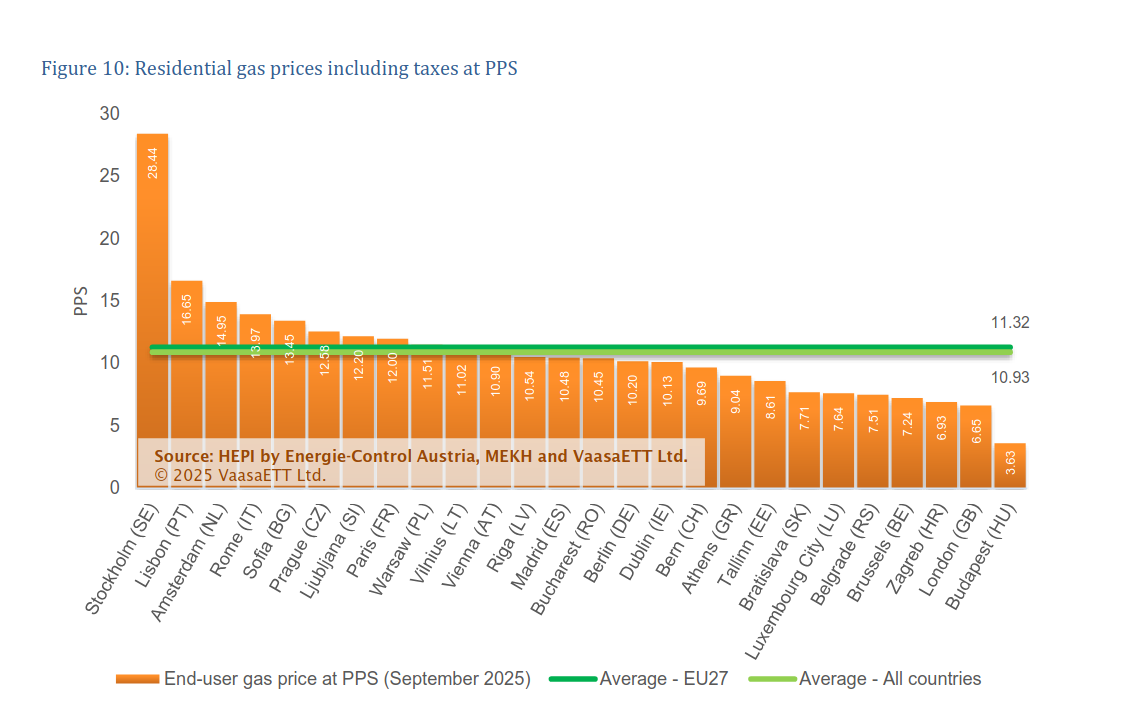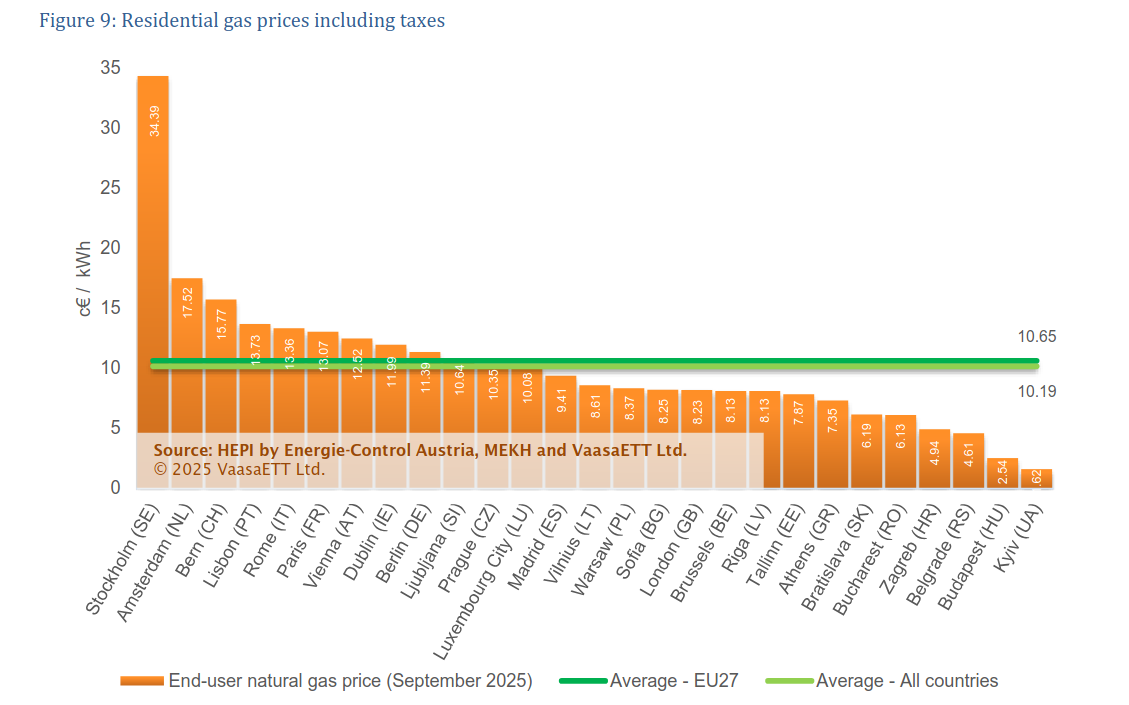 Τέλος, όσον αφορά την τιμή του φυσικού αερίου για οικιακή χρήση, στην κορυφή της σχετικής κατάταξης τον προηγούμενο μήνα βρέθηκε η Στοκχόλμη, τόσο σε ονομαστικούς όσο και σε πραγματικούς όρους (0,34 €/kWh και 0,28 €/kWh αντίστοιχα).