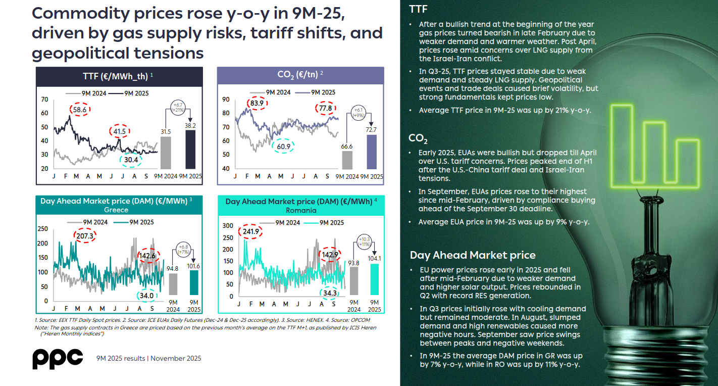 Σημειώνεται ότι το εννεάμηνο του 2025 χαρακτηρίστηκε από αυξημένη μεταβλητότητα στις αγορές ενέργειας, με τις τιμές των βασικών εμπορευμάτων να κινούνται ανοδικά λόγω κινδύνων στην εφοδιαστική αλυσίδα φυσικού αερίου, ανατροπών στη δασμολογική πολιτική και γεωπολιτικών εντάσεων. Η μέση τιμή του φυσικού αερίου TTF αυξήθηκε κατά 21% σε ετήσια βάση, στα €38,2/MWh, μετά από μια χρονιά έντονων διακυμάνσεων που επηρεάστηκαν από την ασθενέστερη ζήτηση, τον ήπιο χειμώνα και τις ανησυχίες για τις ροές LNG, ιδίως μετά τις εντάσεις που προέκυψαν από την κρίση στη Μέση Ανατολή. Στα δικαιώματα εκπομπών CO₂, οι τιμές εμφάνισαν επίσης άνοδο (+9% σε ετήσια βάση), φτάνοντας τα €72,7/τόνο, καθώς η αγορά ανέκαμψε στο τέλος του τρίτου τριμήνου.